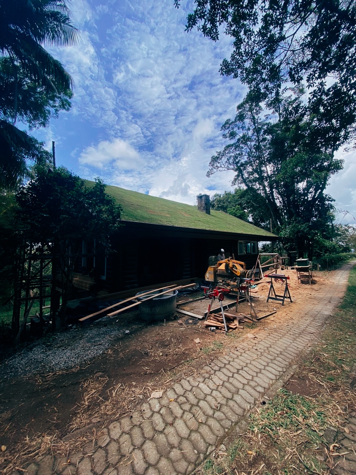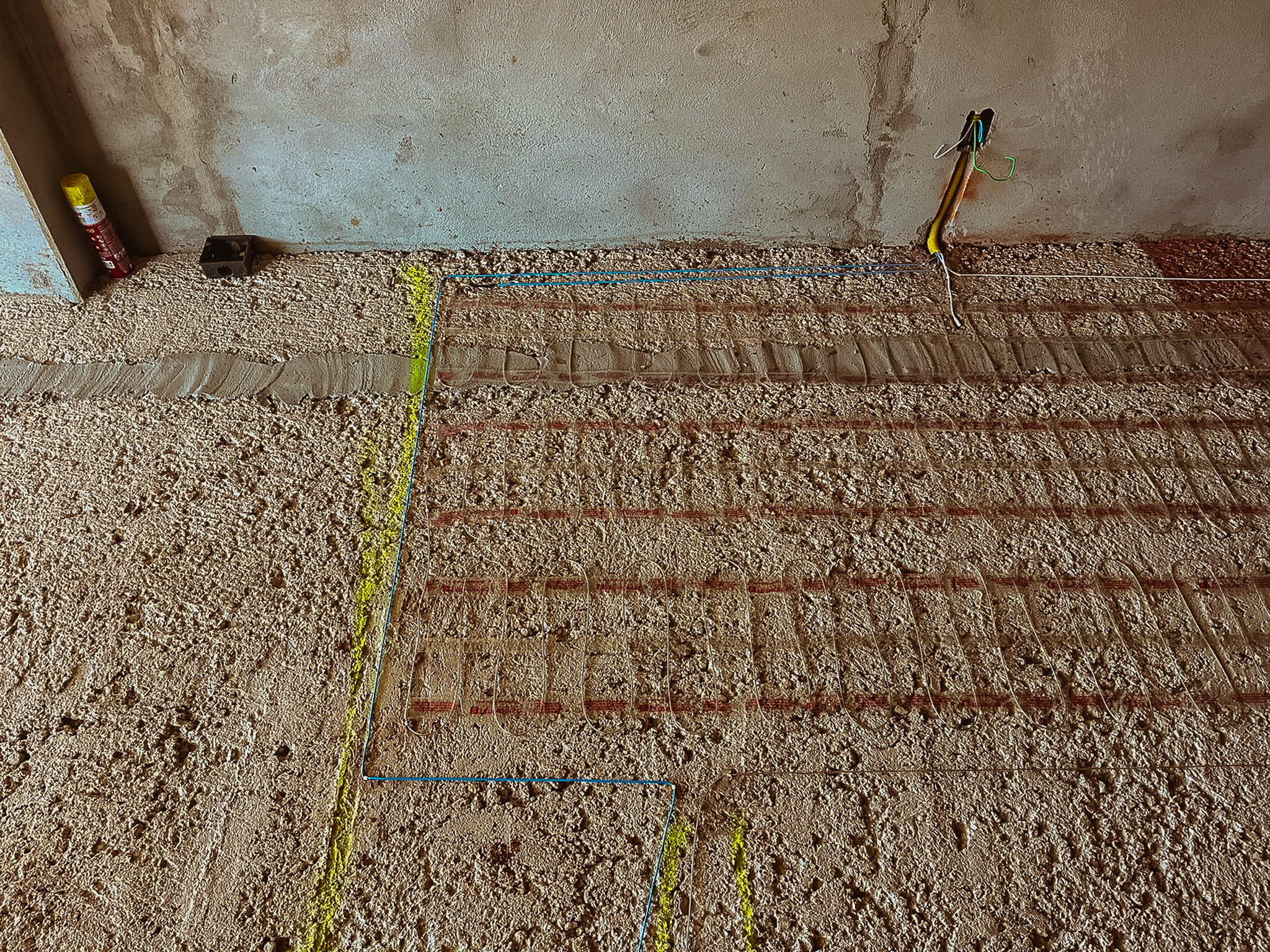 Fixamos os cabos no contra-piso com material adesivo para não precisar furar.